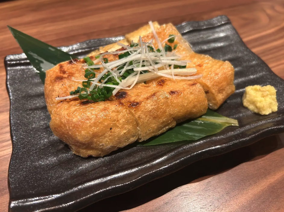 分厚い油揚げに薬味をたっぷり乗せてます。